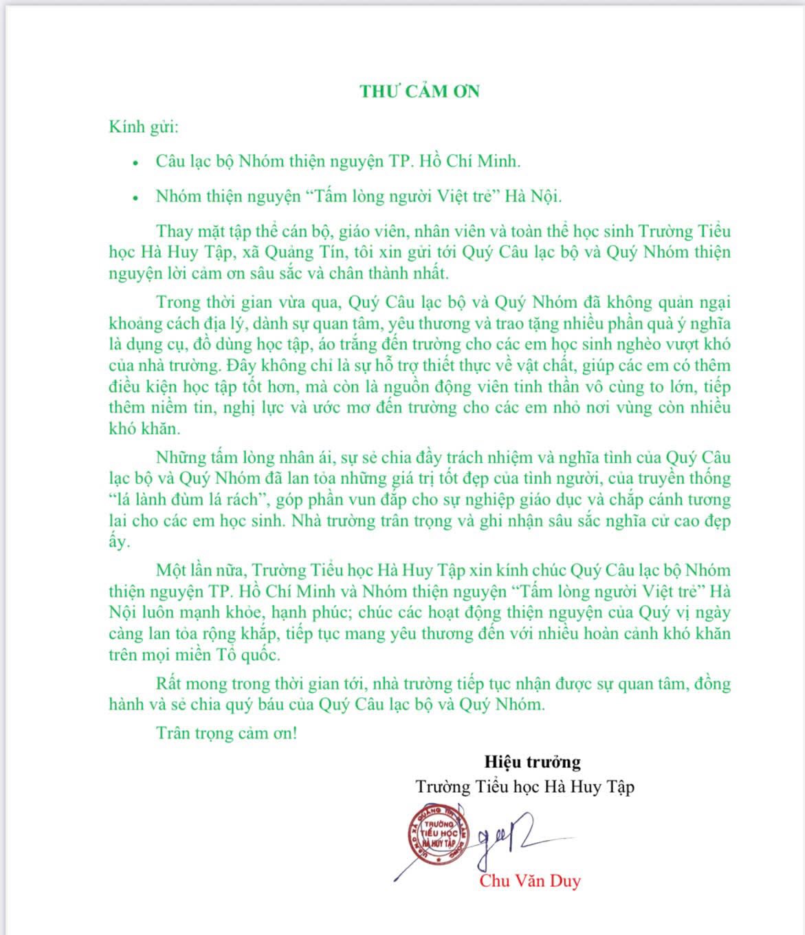 Trường Tiểu học Hà Huy Tập xin trân trọng cảm ơn CLB Thiện nguyện Thành phố Hồ Chí Minh đã quan tâm, sẻ chia và hỗ trợ những phần quà ý nghĩa dành cho học sinh của nhà trường. Sự đồng hành quý báu này là nguồn động viên to lớn, tiếp thêm niềm vui và động lực để các em vươn lên trong học tập.